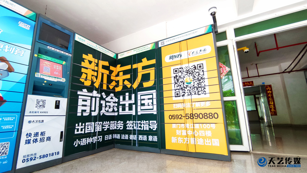 廈門(mén)新東方前途出國服務(wù)機構位于鷺江道財務(wù)中心四樓,與廈門(mén)天藝傳媒合作,目前在主干道路名牌與生活小區的快遞柜媒體進(jìn)行部分宣傳合作。